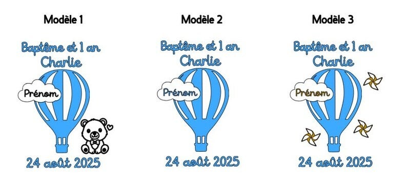 Si vous souhaitez un autre élément à côté de la mongolfière, n'hésitez pas à l'indiquez dans la partie "précisions". Je vous enverrais ensuite un visuel par mail avant de passer à la réalisation.