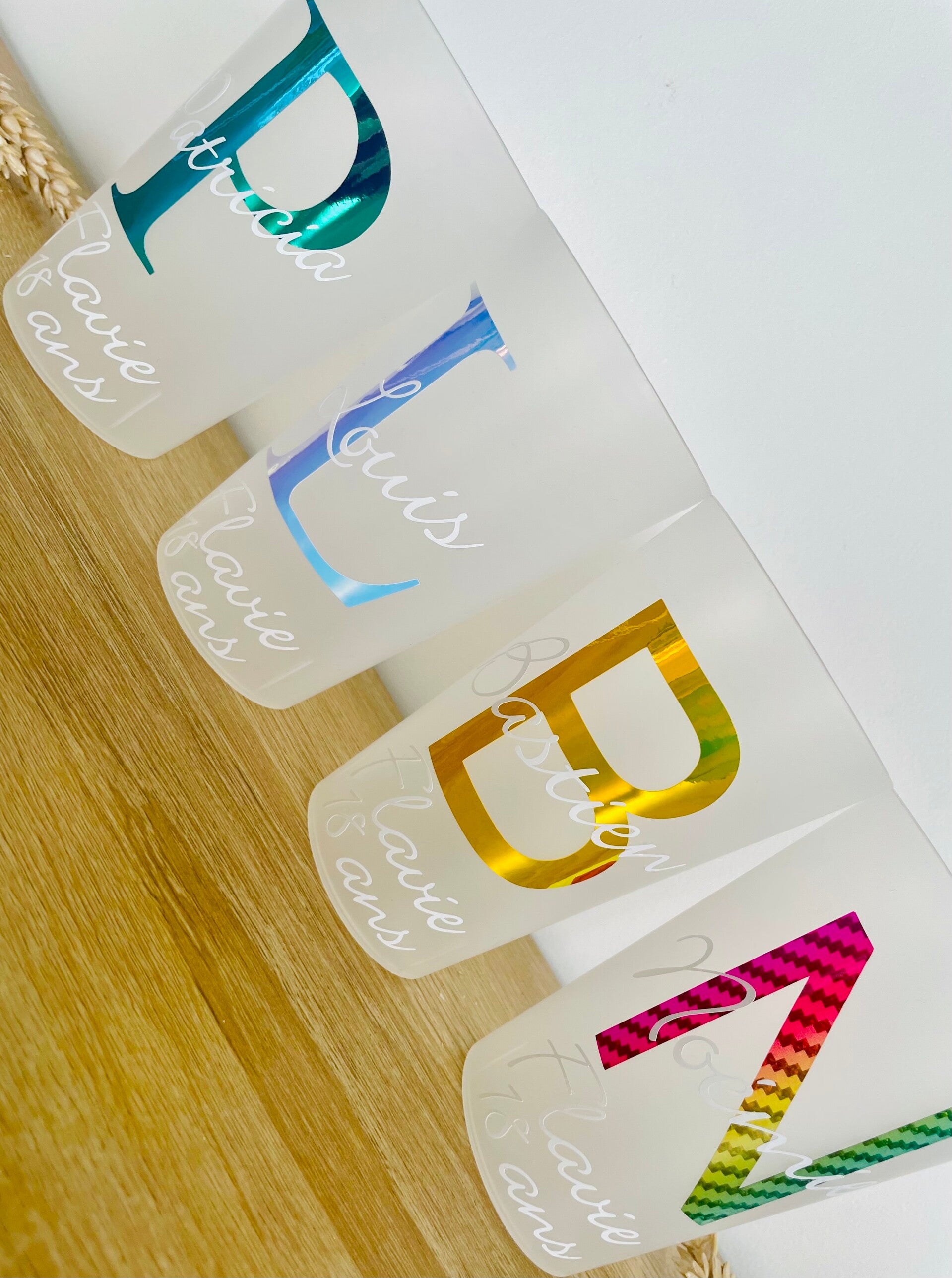Gobelet personnalisé avec l’initiale et le prénom de vos invités. Idéal pour les anniversaires, mariages ou baptêmes. Vos invités auront ainsi leur propre gobelet à leur nom qu’ils pourront garder en souvenirs.