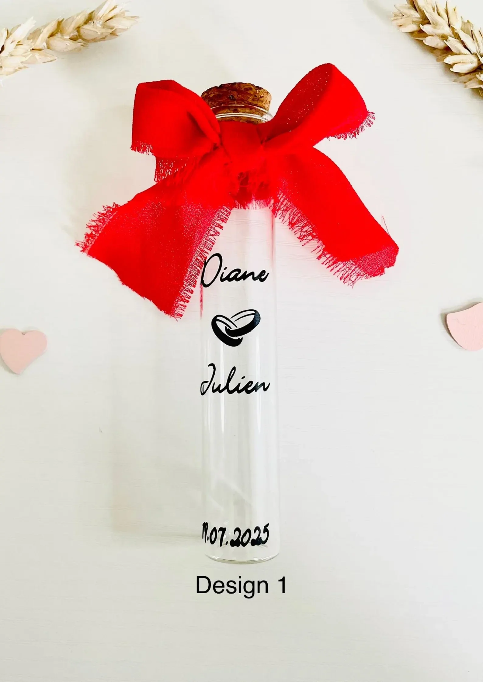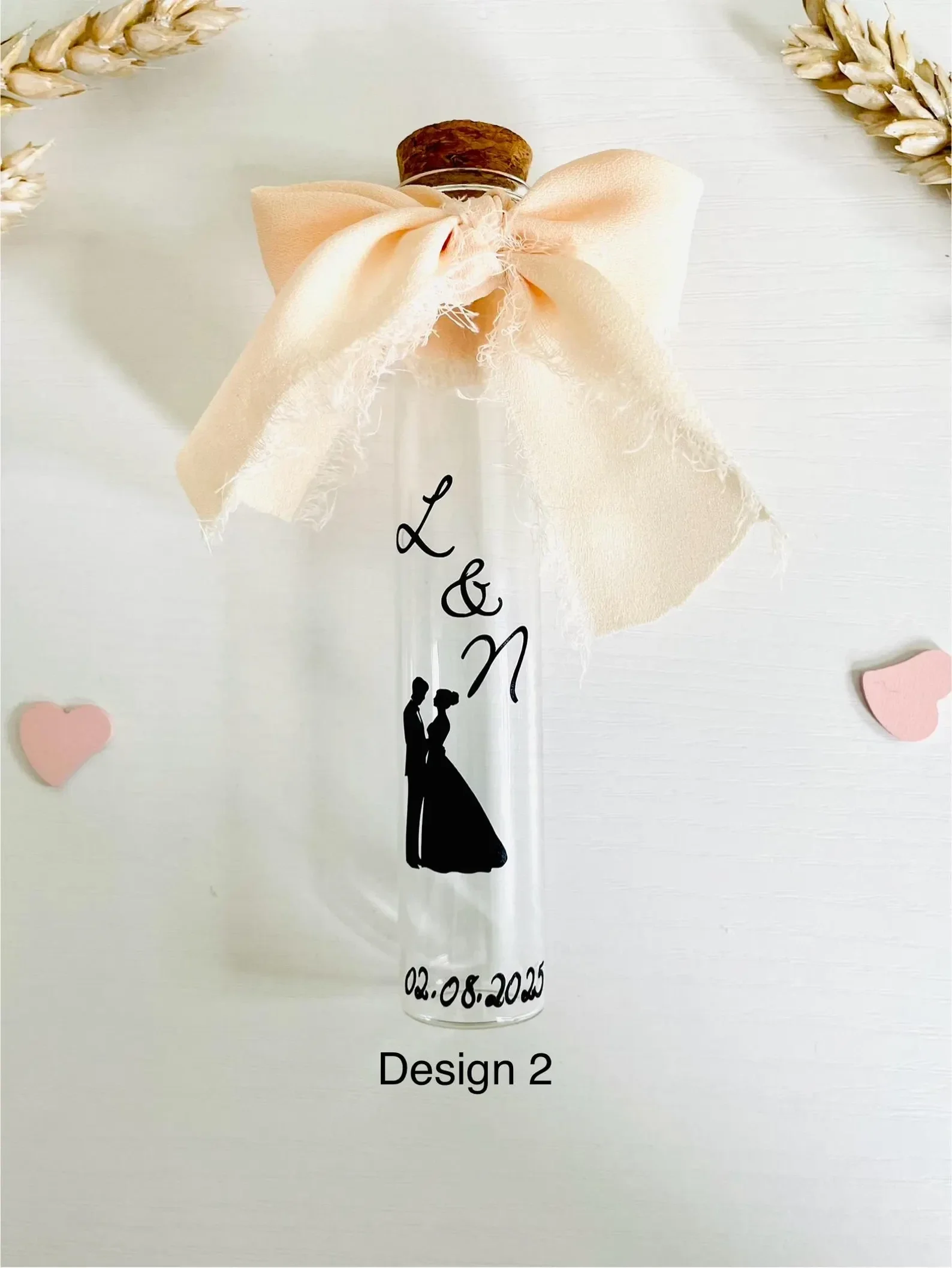 Apportez une touche spéciale à vos cadeaux pour invités avec ces éprouvettes en verre entièrement personnalisées. Ces petites fioles élégantes peuvent être remplies de dragées, bonbons ou toutes autres sucreries.