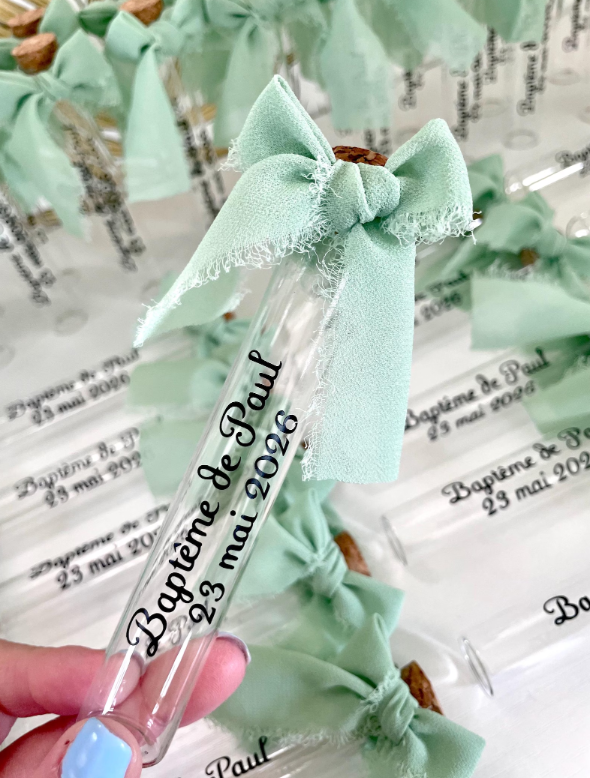 Apportez une touche spéciale au baptême de votre enfant avec ces éprouvettes en verre entièrement personnalisées. Ces petites fioles raffinées peuvent être remplies de dragées, bonbons ou toutes autre sucreries.