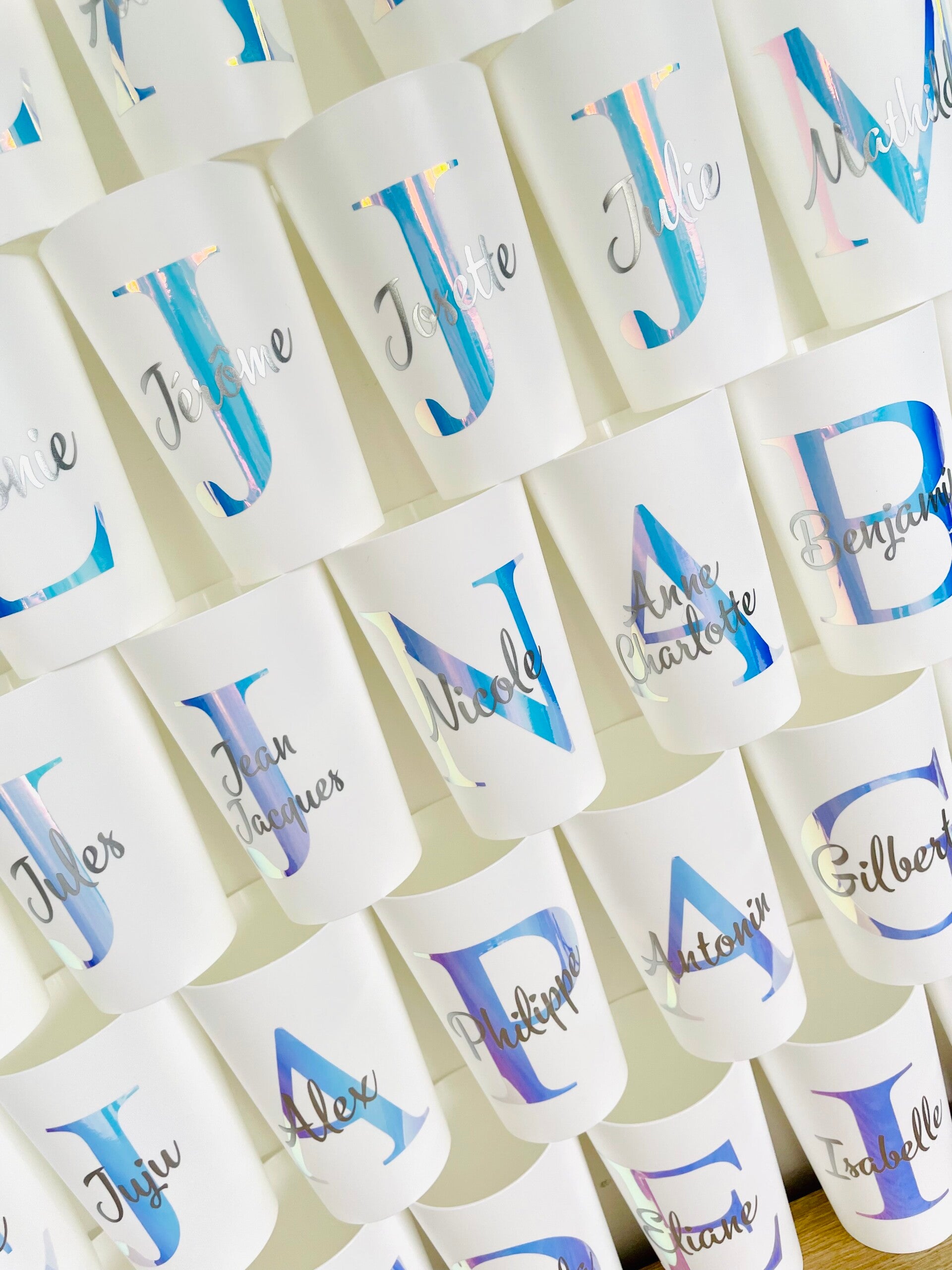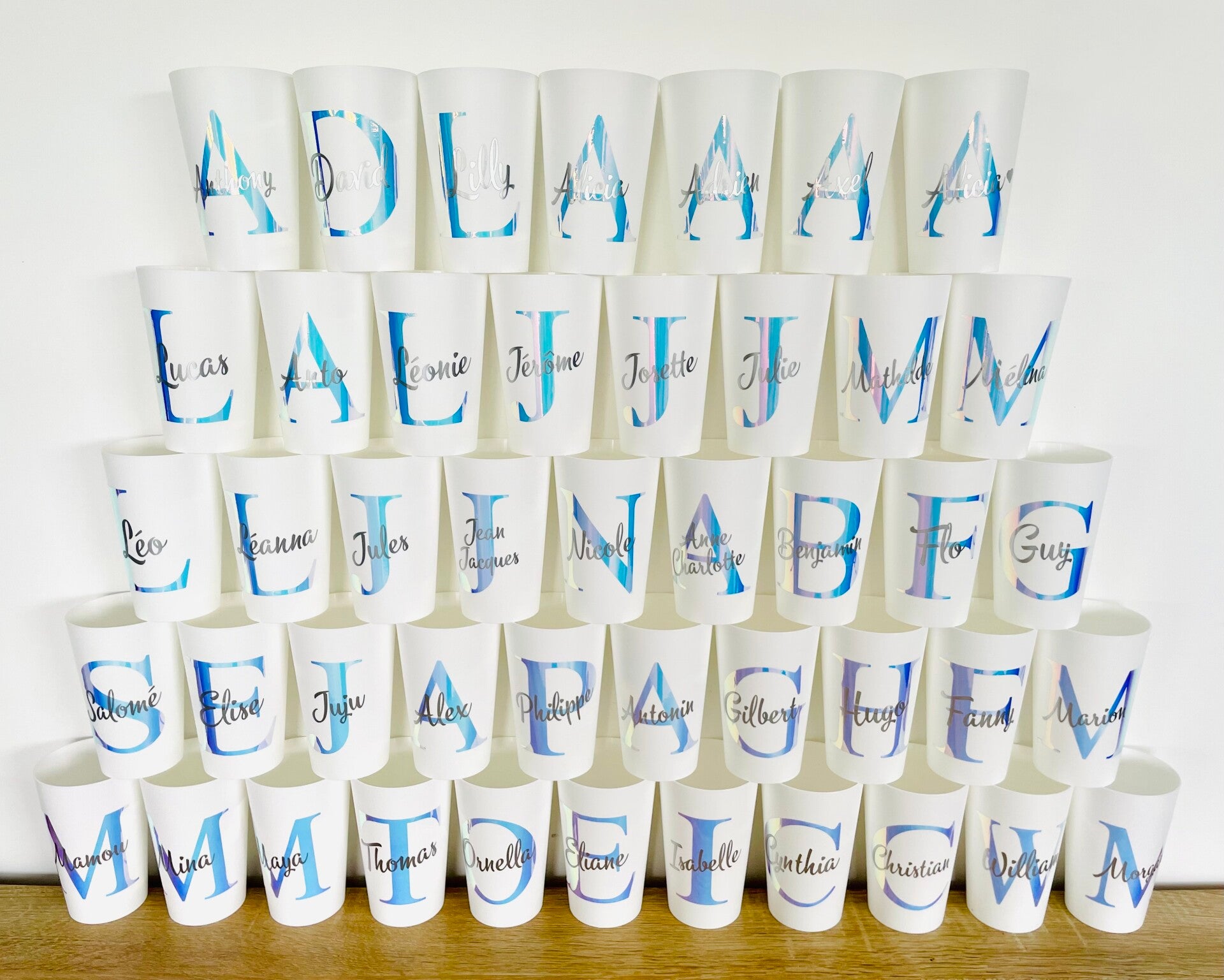 Gobelet blanc personnalisé avec l’initiale et le prénom de vos invités. Idéal pour les anniversaires, mariages ou baptêmes. Vos invités auront ainsi leur propre gobelet à leur nom qu’ils pourront garder en souvenirs. Il est tout à fait possible d’ajouter une inscription sous l’initiale.