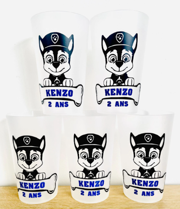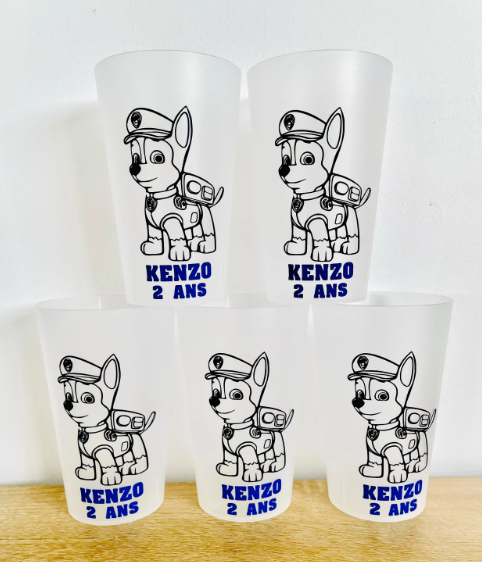 Gobelet personnalisé Chase de la Pat'Patrouille, idéal pour un anniversaire, un baptême ou tout simplement pour faire plaisir à votre enfant.