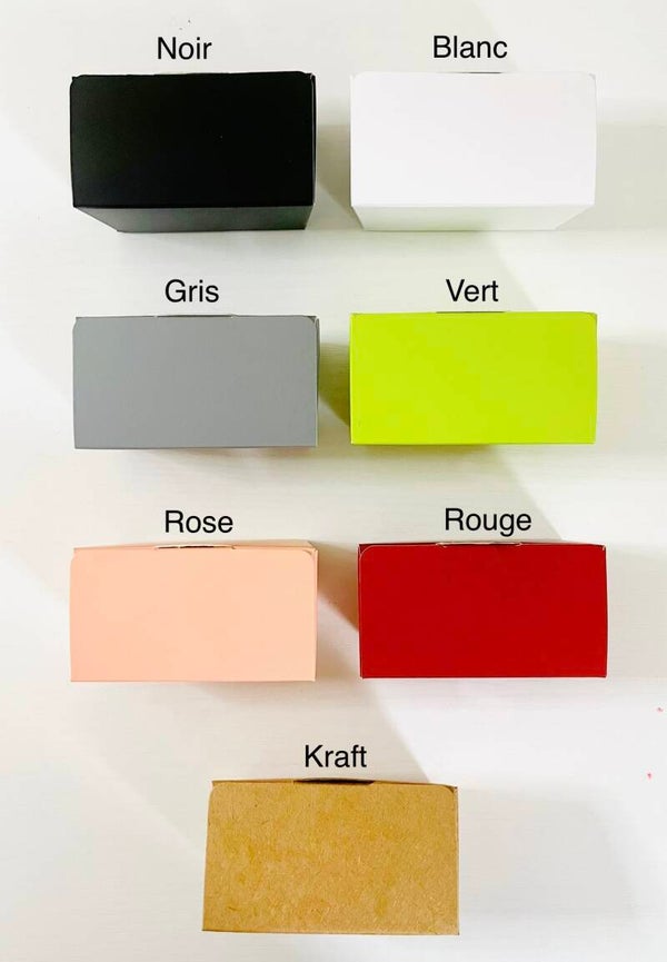 Les boîtes noires, blanches, vertes et rouges ont l’intérieur doré. Les boîtes roses et grises ont l’intérieur argenté. Boîtes vendues vides, sans dragées.