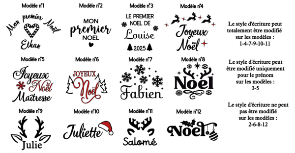 Indiquez ici la couleur du ruban, le style d'écriture ainsi que la ou les couleur(s) d'écriture + le prénom à ajouter (en fonction du modèle)
